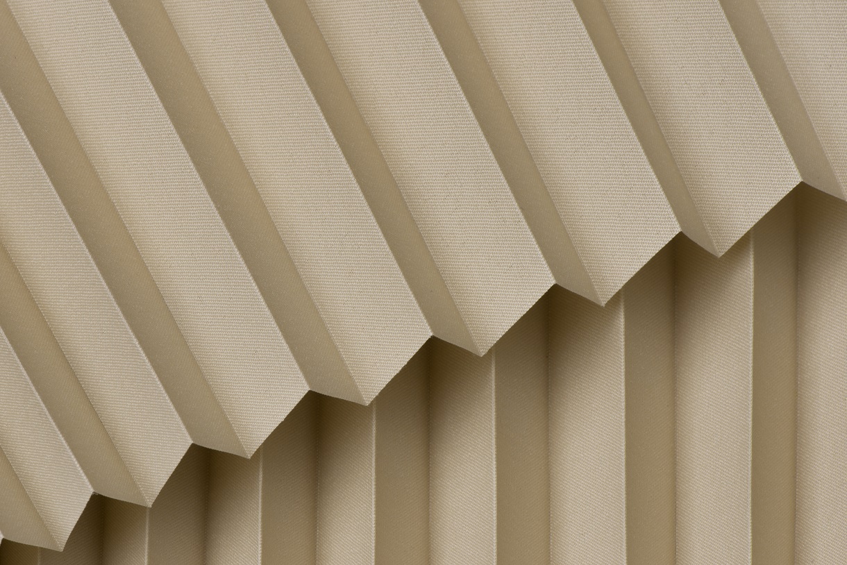 DIEGO – lekka tkanina poliestrowa (153 g/m²) o trwałych kolorach i przepuszczalności światła 28–48%. Plisowane lamelki (20 mm) nadają jej wyjątkowy wygląd, a delikatna grubość 0,4 mm sprawia, że jest subtelna i elegancka.