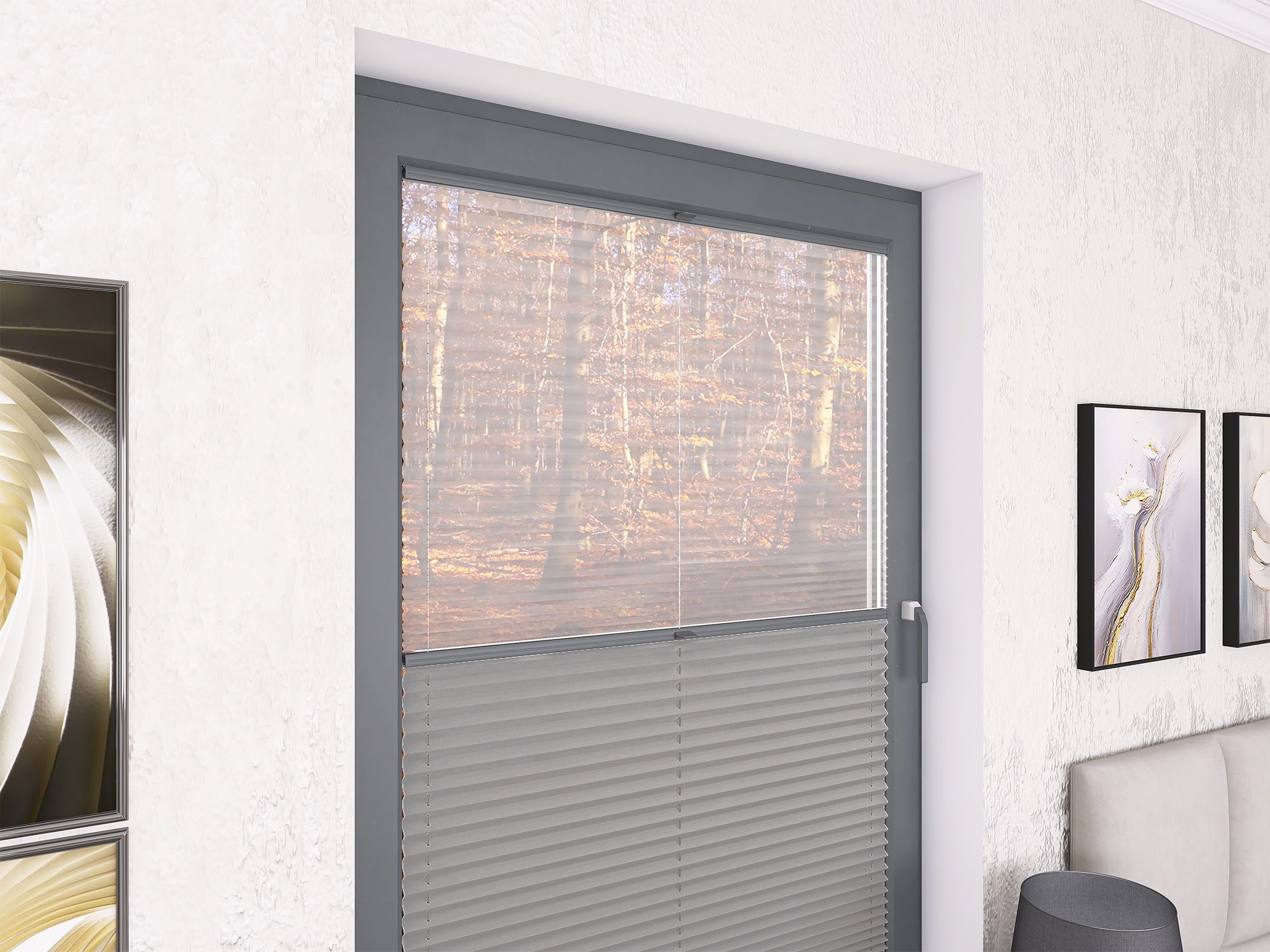 DIEGO – lekka tkanina poliestrowa (153 g/m²) o trwałych kolorach i przepuszczalności światła 28–48%. Plisowane lamelki (20 mm) nadają jej wyjątkowy wygląd, a delikatna grubość 0,4 mm sprawia, że jest subtelna i elegancka.