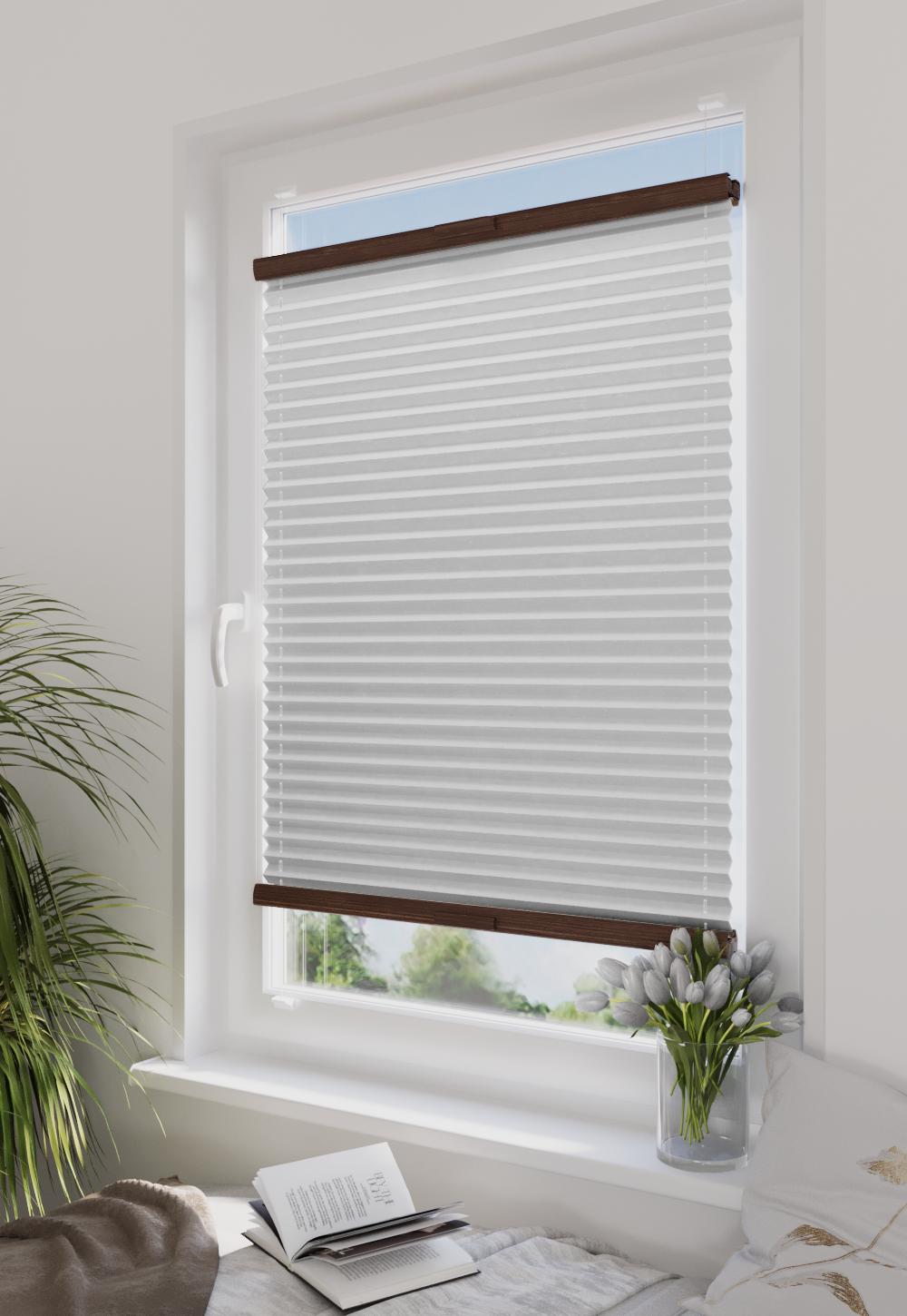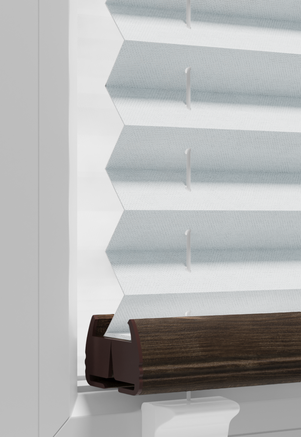 DIEGO – lekka tkanina poliestrowa (153 g/m²) o trwałych kolorach i przepuszczalności światła 28–48%. Plisowane lamelki (20 mm) nadają jej wyjątkowy wygląd, a delikatna grubość 0,4 mm sprawia, że jest subtelna i elegancka.
