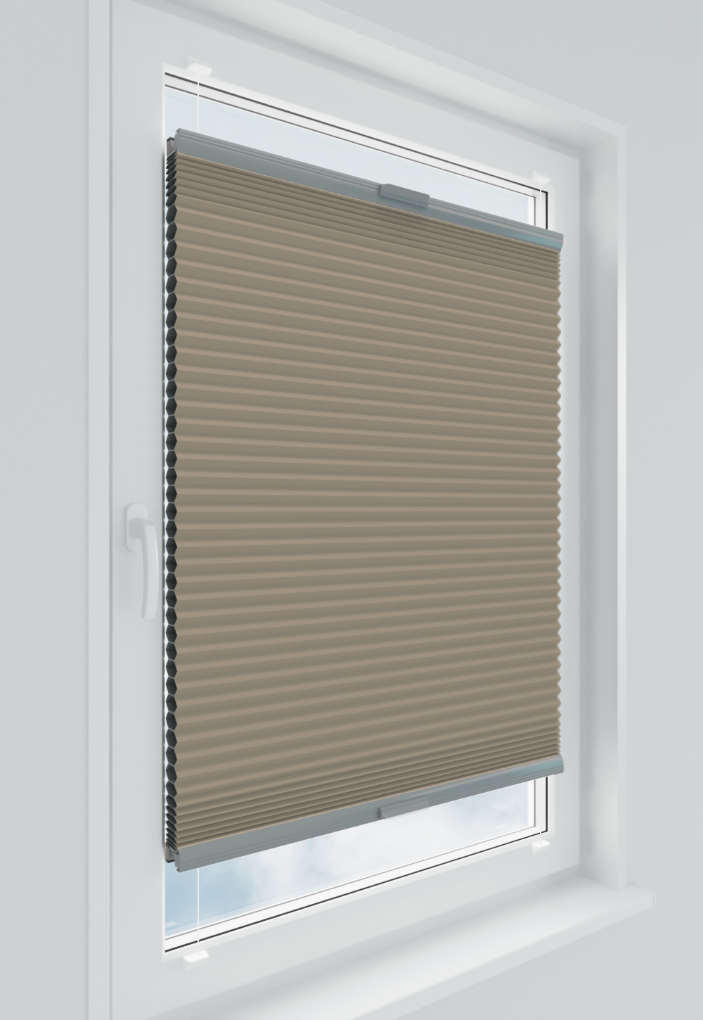 Roleta plisowana typu plaster miodu w kolorze beżowym z profilem anoda. Dzięki swojej strukturze zapewnia doskonałą izolację termiczną i estetykę. Idealna do każdego typu pomieszczeń – od salonu po biuro. System AD5 gwarantuje trwałość, łatwość montażu i wygodną obsługę.