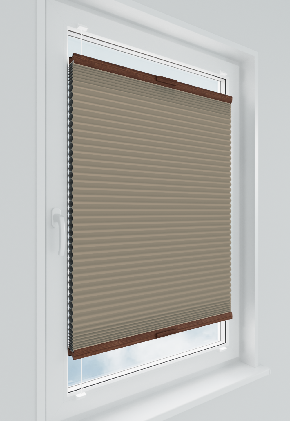 Roleta plisowana typu plaster miodu w kolorze beżowym z profilem orzech. Dzięki swojej strukturze zapewnia doskonałą izolację termiczną i estetykę. Idealna do każdego typu pomieszczeń – od salonu po biuro. System AD5 gwarantuje trwałość, łatwość montażu i wygodną obsługę.