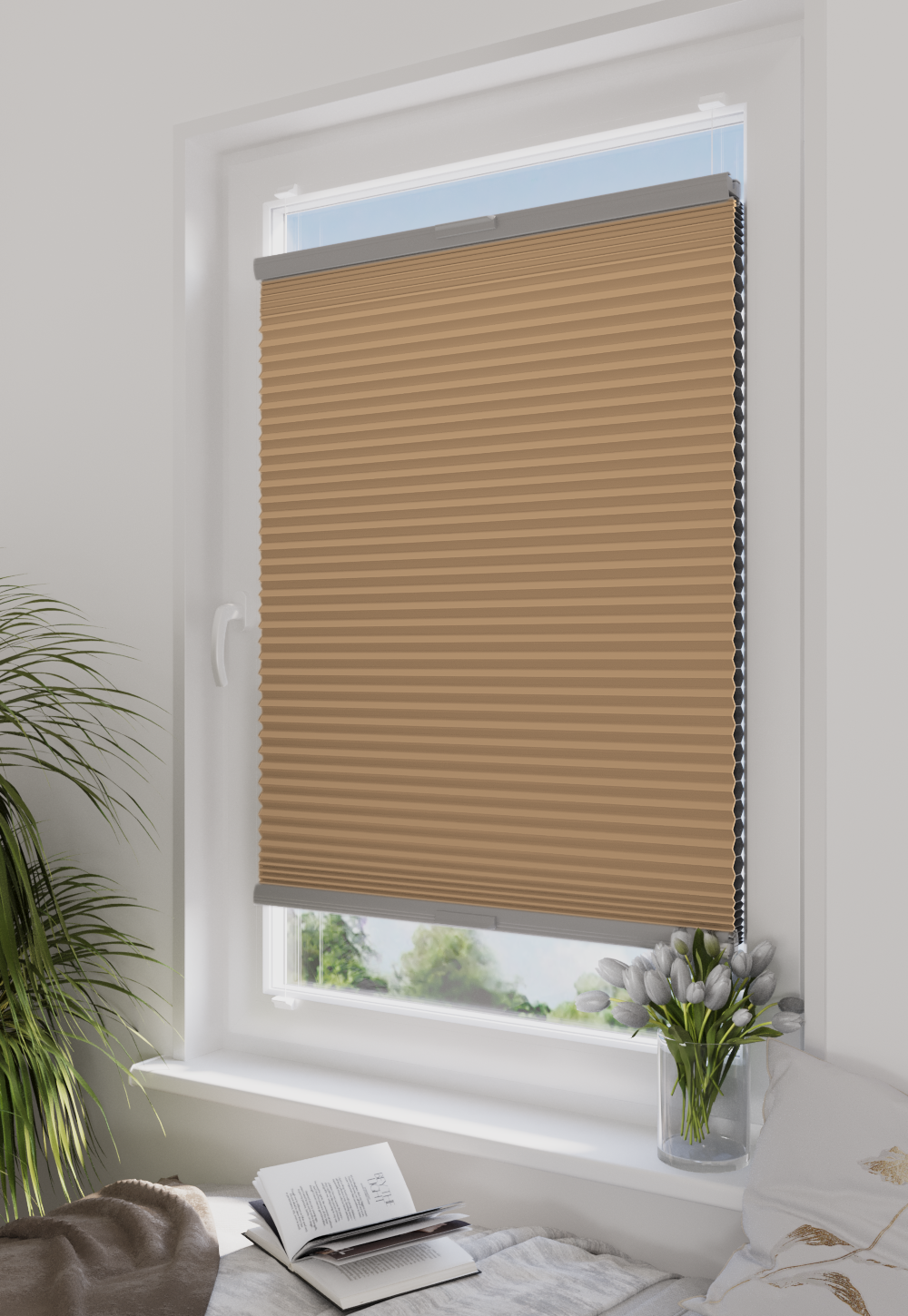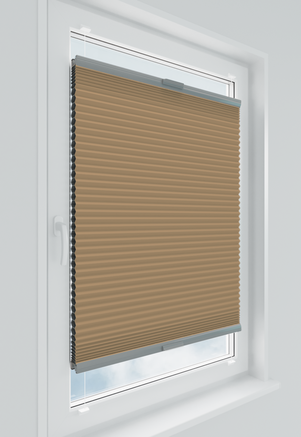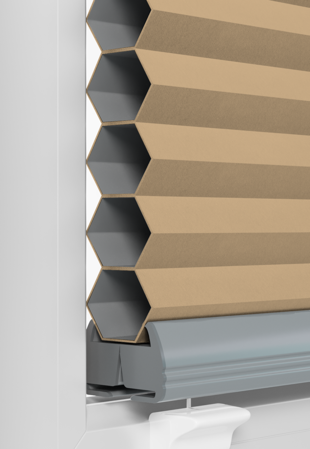 Roleta plisowana typu plaster miodu w kolorze beżowym z profilem anoda. Dzięki swojej strukturze zapewnia doskonałą izolację termiczną i estetykę. Idealna do każdego typu pomieszczeń – od salonu po biuro. System AD5 gwarantuje trwałość, łatwość montażu i wygodną obsługę.