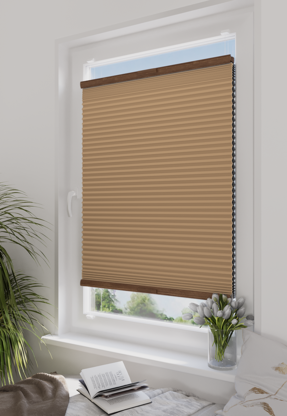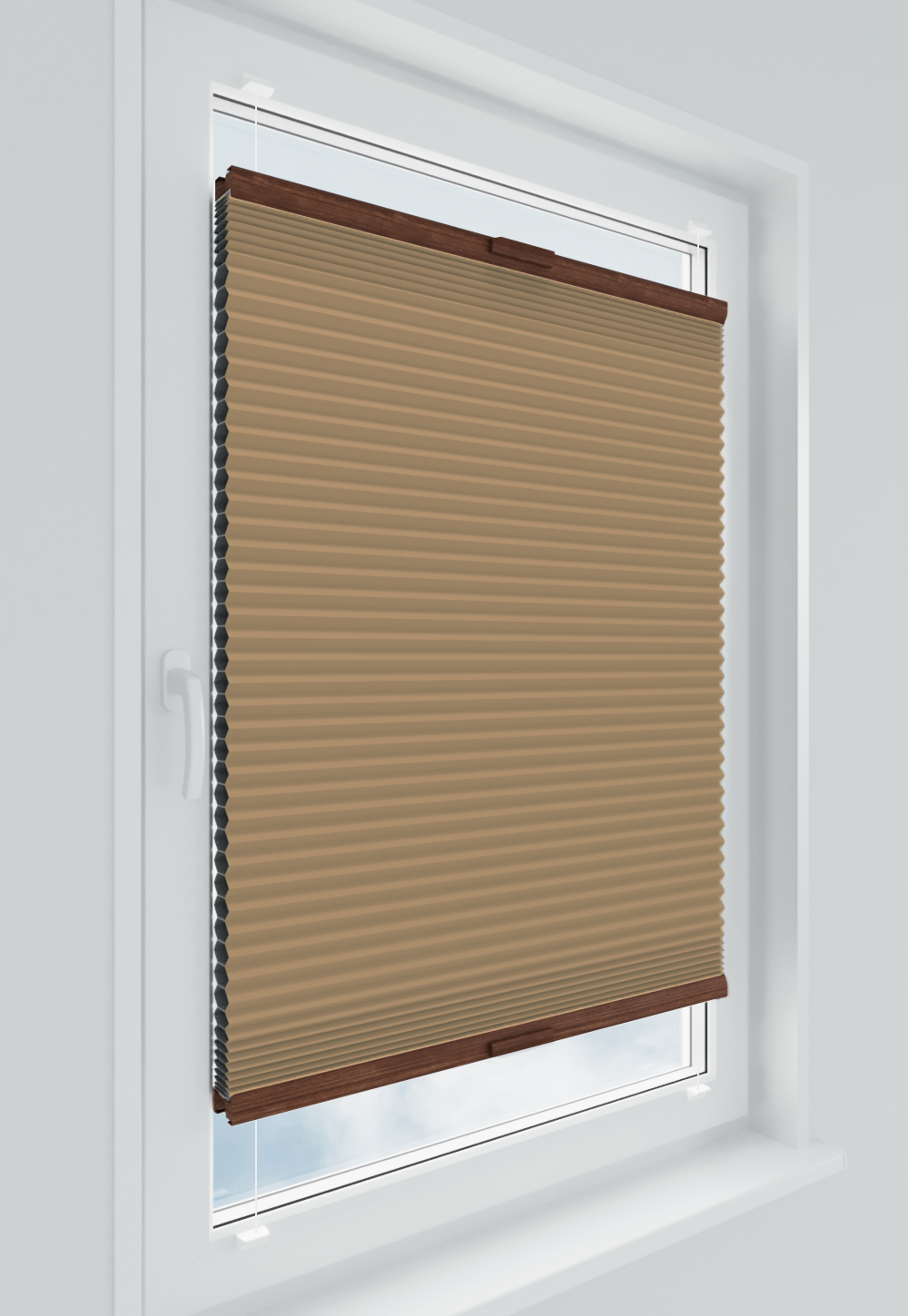 Roleta plisowana typu plaster miodu w kolorze beżowym z profilem orzech. Dzięki swojej strukturze zapewnia doskonałą izolację termiczną i estetykę. Idealna do każdego typu pomieszczeń – od salonu po biuro. System AD5 gwarantuje trwałość, łatwość montażu i wygodną obsługę.