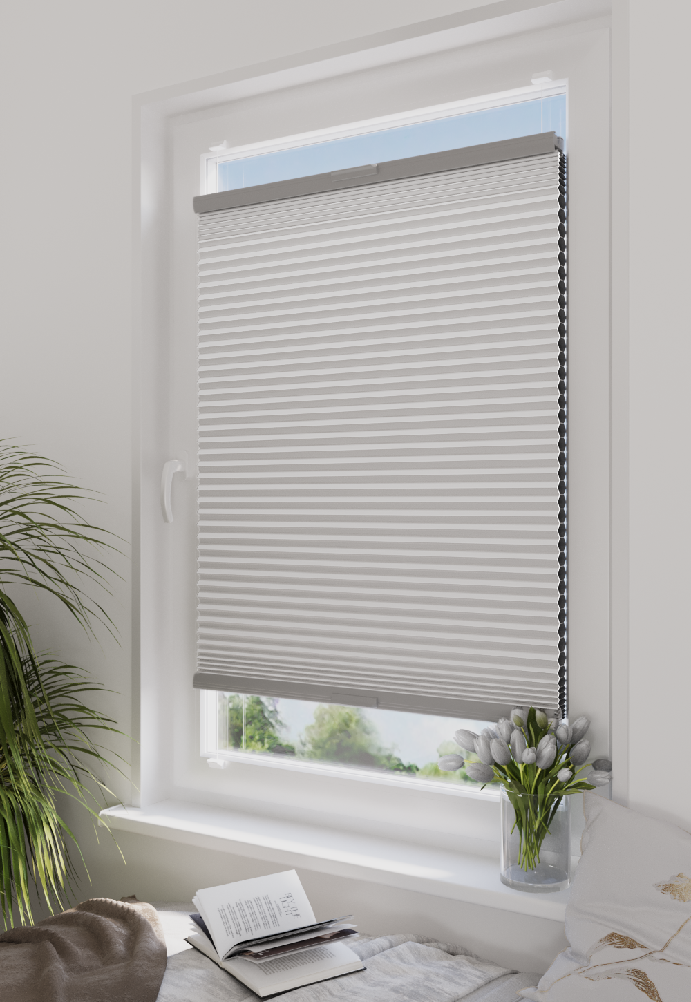 Roleta plisowana AD1 z tkaniną w kolorze białym i profilem anoda to idealne połączenie lekkości i nowoczesnego designu. Świetnie sprawdzi się w jasnych, minimalistycznych przestrzeniach.