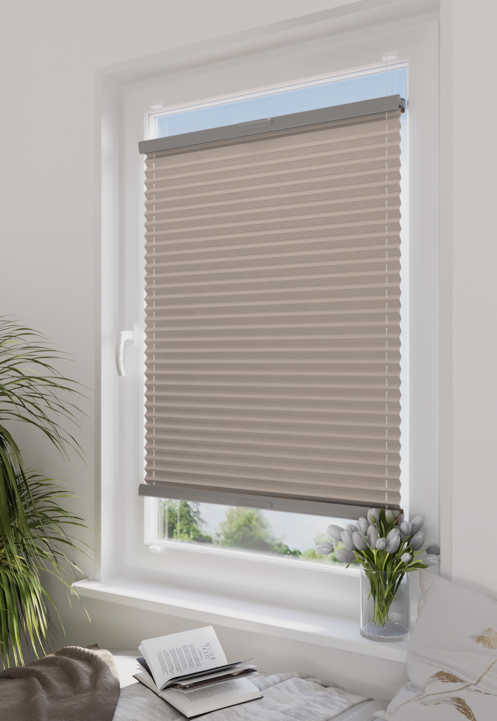 DIEGO PEARL – tkanina z powłoką odbijającą światło, gramatura 167 g/m². Transmisja światła od 0,30% do 15,62% w zależności od koloru. Eleganckie plisy (20 mm) i delikatna struktura (0,4 mm) gwarantują stylowy wygląd i wysoki komfort.