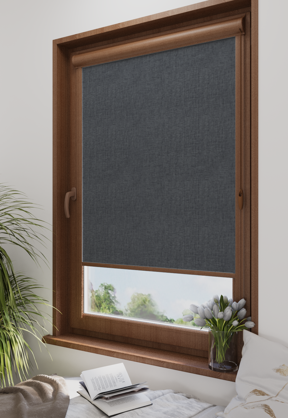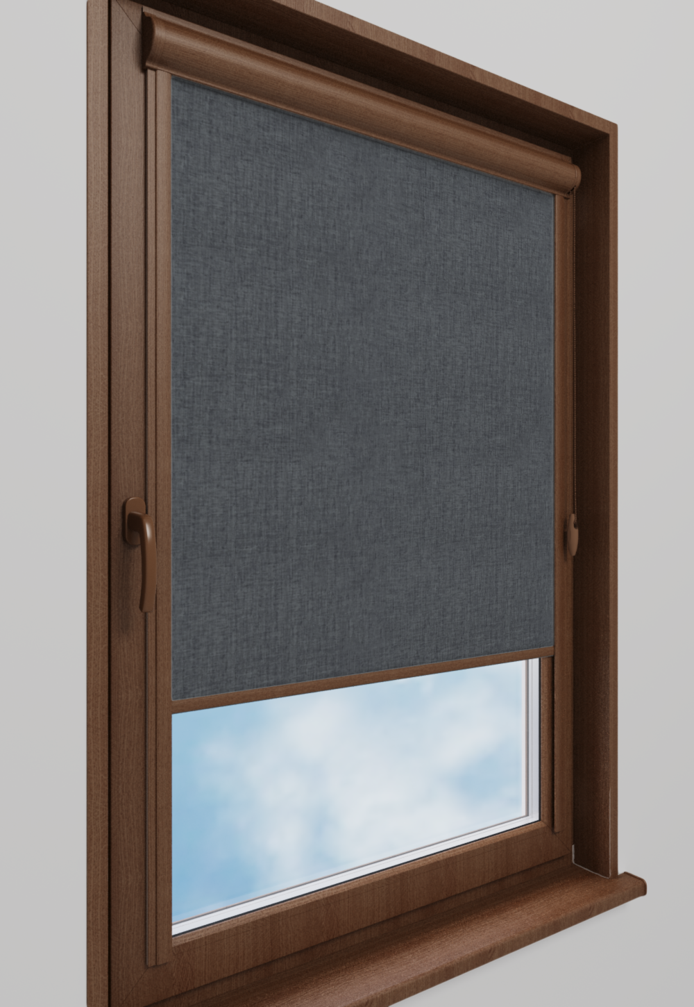 Roleta w kasecie Classic Tkanina Blackout 0018 Ciemny szary melanż – kaseta orzech