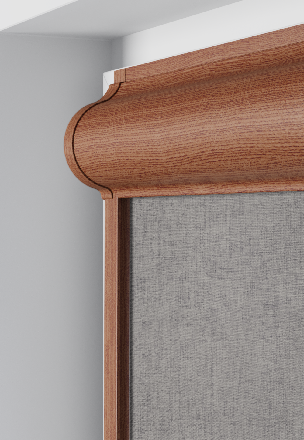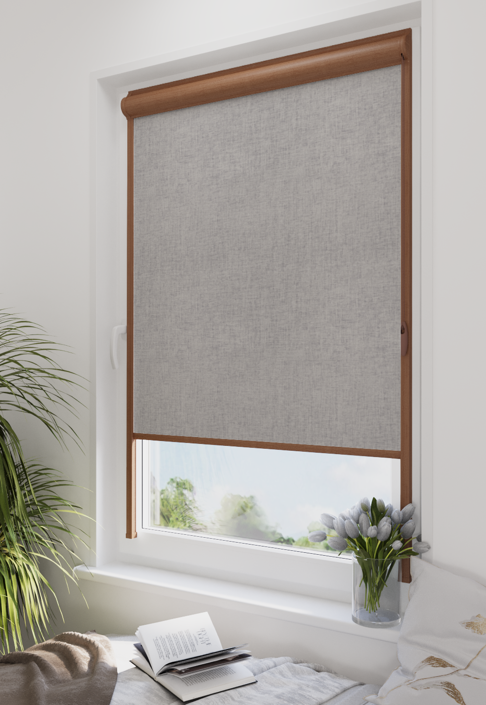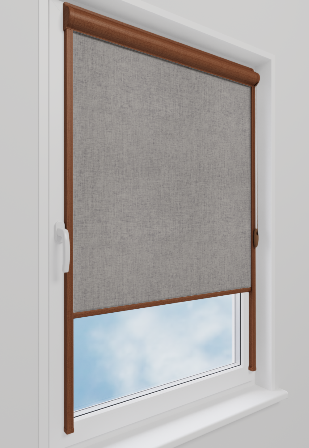 Roleta w kasecie LORD Tkanina Blackout 0014 Jasny szary melanż – kaseta złoty dąb