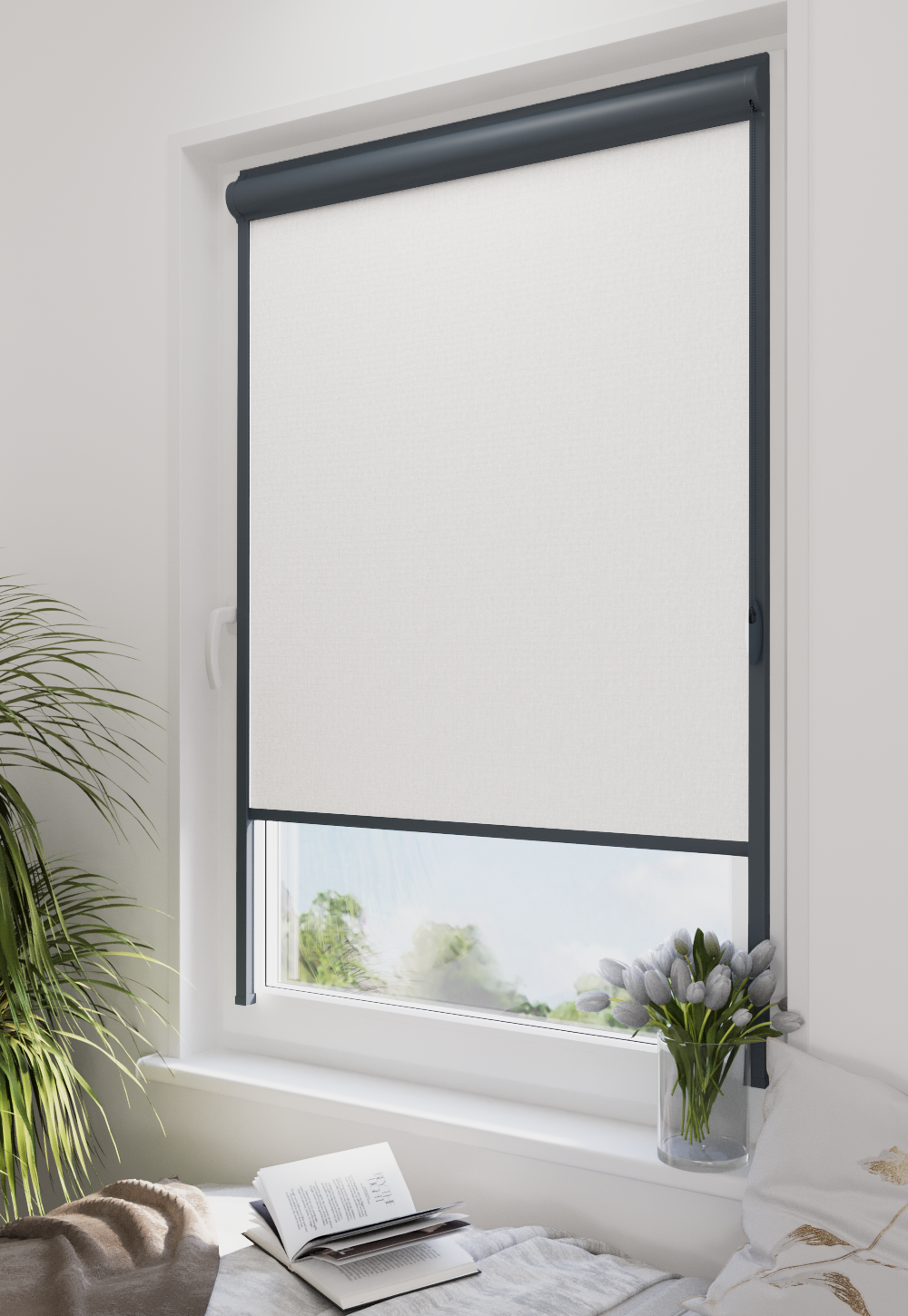 Roleta w kasecie LORD Tkanina Blackout 051 Biały gładki – kaseta antracyt