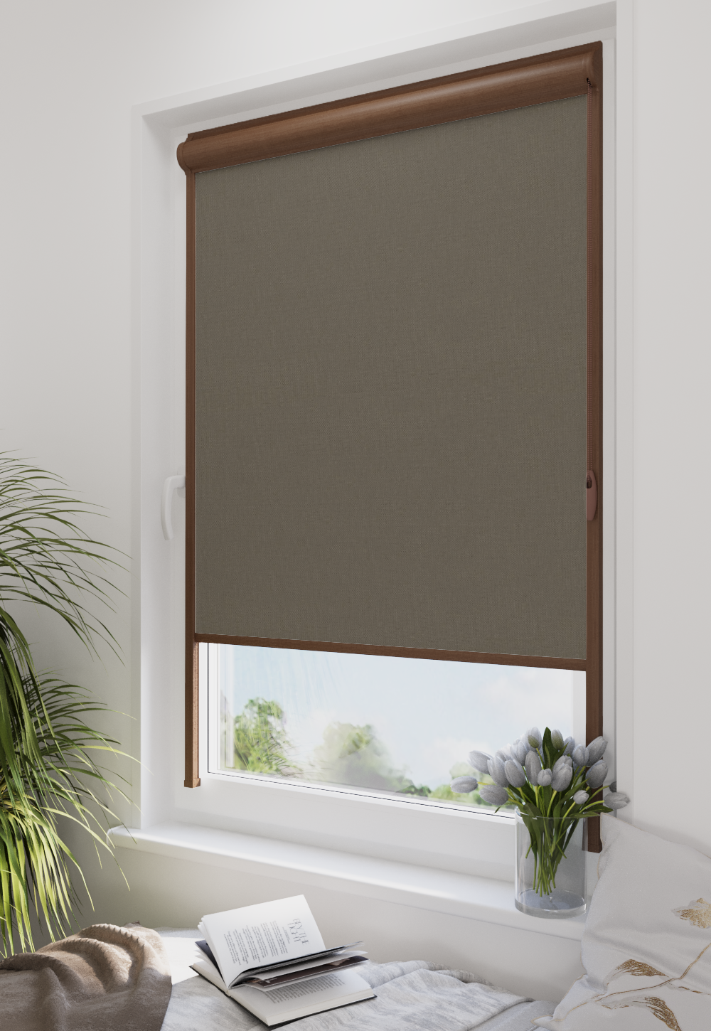 Roleta w kasecie LORD Tkanina Blackout 061 Grafit gładki – kaseta orzech