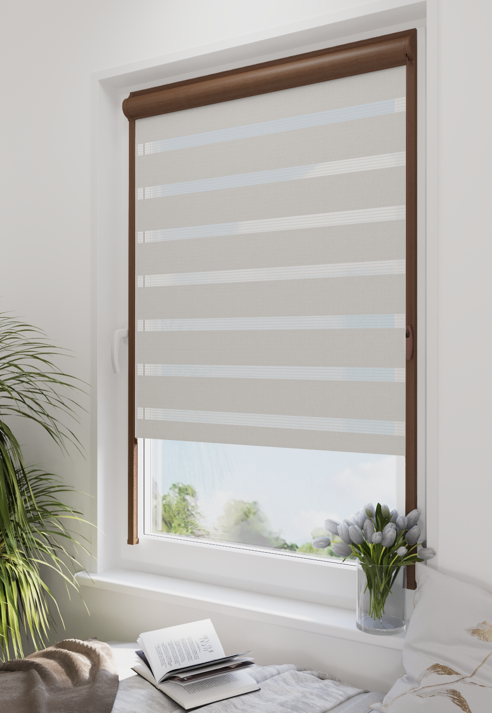 Roleta w kasecie LORD Tkanina Dzień Noc BH-21 Jasny Szary - kaseta ciemny orzech